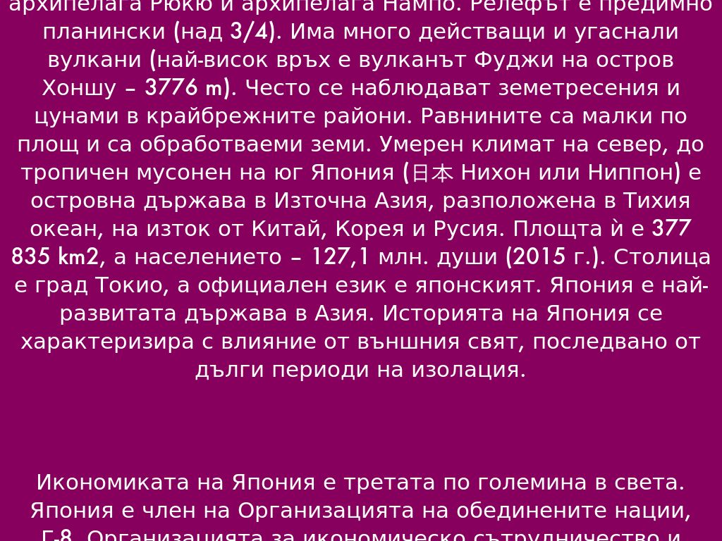 Япония е разположена на Японските острови в Тихия океан (Хоншу, Хокайдо, Кюшу, Шикоку и около 6800 по-малки), архипелага Рюкю и архипелага Нампо. Релефът е предимно планински (над 3/4). Има много действащи и угаснали вулкани (най-висок връх е вулканът Фуджи на остров Хоншу – 3776 m). Често се наблюдават земетресения и цунами в крайбрежните райони. Равнините са малки по площ и са обработваеми земи. Умерен климат на север, до тропичен мусонен на юг Япония (日本 Нихон или Ниппон) е островна държава в Източна Азия, разположена в Тихия океан, на изток от Китай, Корея и Русия. Площта ѝ е 377 835 km2, а населението – 127,1 млн. души (2015 г.). Столица е град Токио, а официален език е японският. Япония е най-развитата държава в Азия. Историята на Япония се характеризира с влияние от външния свят, последвано от дълги периоди на изолация.