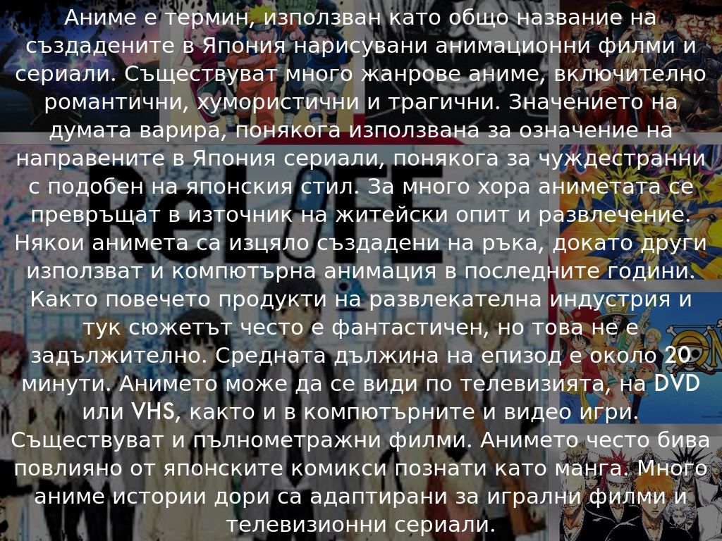 Аниме е термин, използван като общо название на създадените в Япония нарисувани анимационни филми и сериали. Съществуват много жанрове аниме, включително романтични, хумористични и трагични. Значението на думата варира, понякога използвана за означение на направените в Япония сериали, понякога за чуждестранни с подобен на японския стил. За много хора аниметата се превръщат в източник на житейски опит и развлечение. Някои анимета са изцяло създадени на ръка, докато други използват и компютърна анимация в последните години. Както повечето продукти на развлекателна индустрия и тук сюжетът често е фантастичен, но това не е задължително. Средната дължина на епизод е около 20 минути. Анимето може да се види по телевизията, на DVD или VHS, както и в компютърните и видео игри. Съществуват и пълнометражни филми. Анимето често бива повлияно от японските комикси познати като манга. Много аниме истории дори са адаптирани за игрални филми и телевизионни сериали.