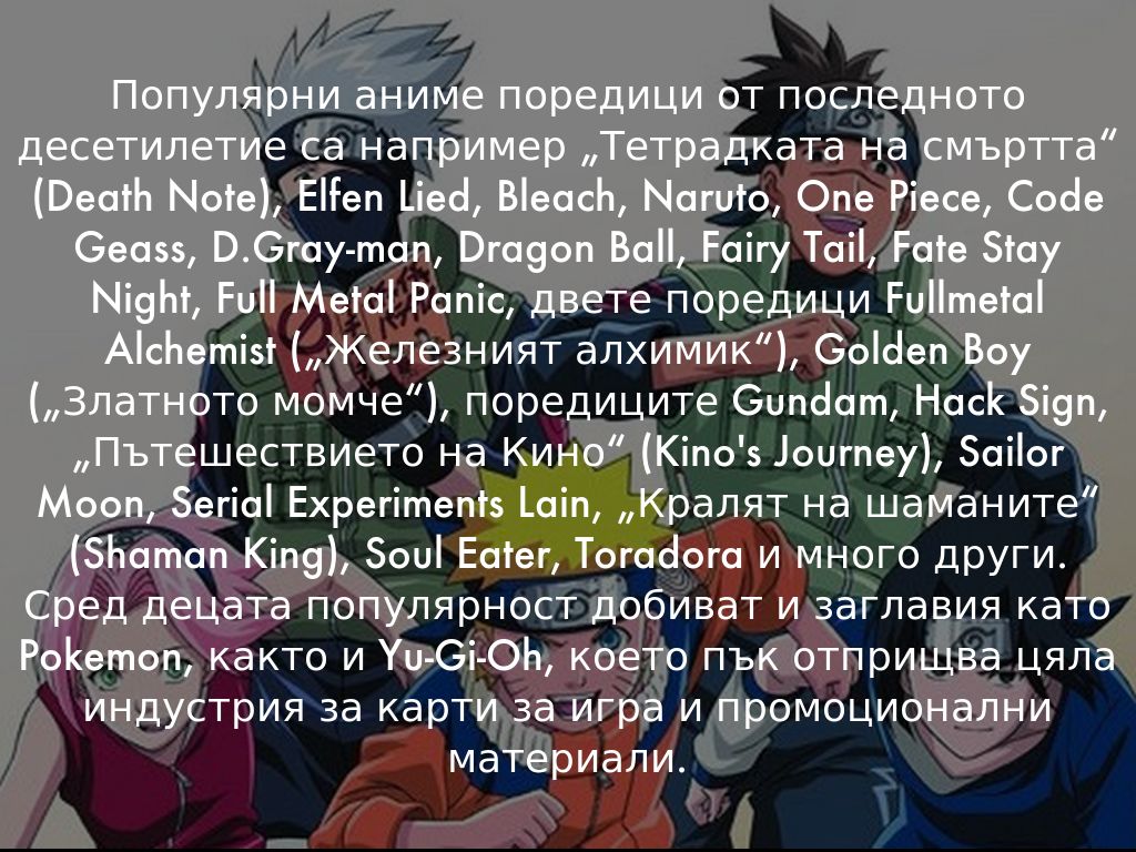 Популярни аниме поредици от последното десетилетие са например „Тетрадката на смъртта“ (Death Note), Elfen Lied, Bleach, Naruto, One Piece, Code Geass, D.Gray-man, Dragon Ball, Fairy Tail, Fate Stay Night, Full Metal Panic, двете поредици Fullmetal Alchemist („Железният алхимик“), Golden Boy („Златното момче“), поредиците Gundam, Hack Sign, „Пътешествието на Кино“ (Kino's Journey), Sailor Moon, Serial Experiments Lain, „Кралят на шаманите“ (Shaman King), Soul Eater, Toradora и много други. Сред децата популярност добиват и заглавия като Pokemon, както и Yu-Gi-Oh, което пък отприщва цяла индустрия за карти за игра и промоционални материали.