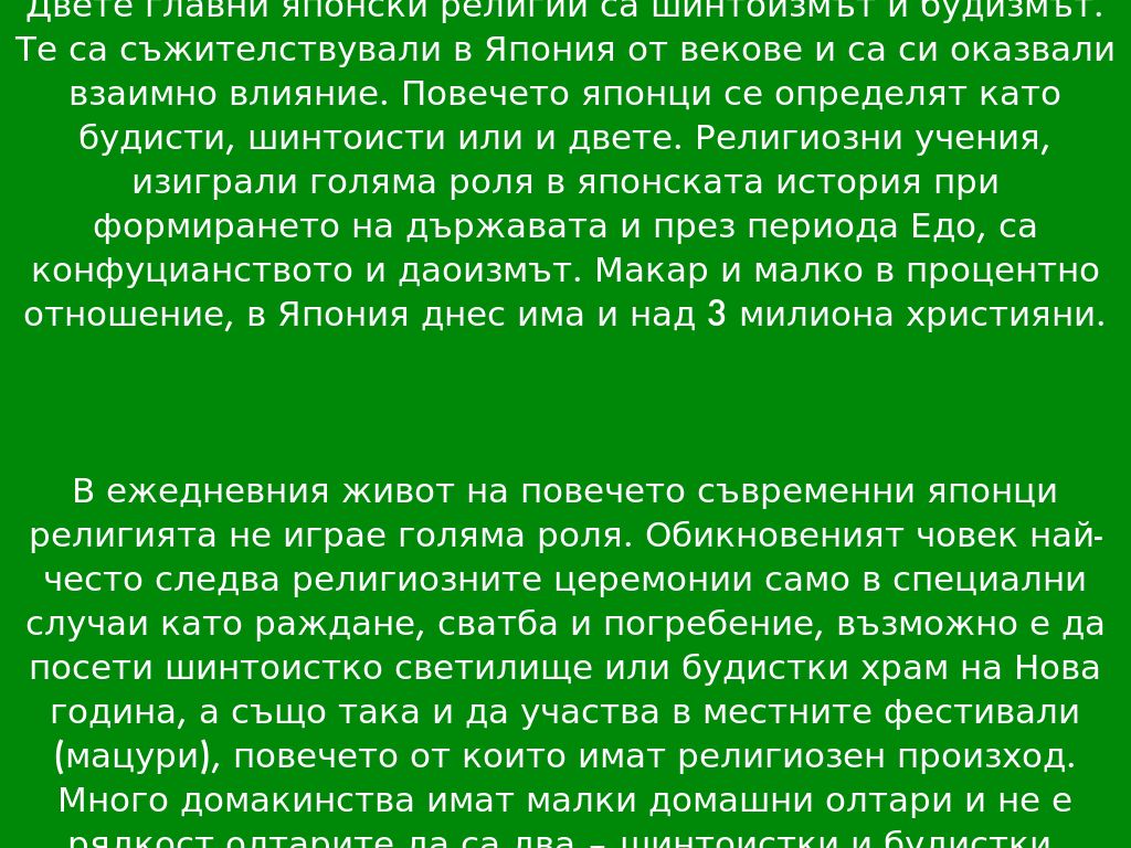 Двете главни японски религии са шинтоизмът и будизмът. Те са съжителствували в Япония от векове и са си оказвали взаимно влияние. Повечето японци се определят като будисти, шинтоисти или и двете. Религиозни учения, изиграли голяма роля в японската история при формирането на държавата и през периода Едо, са конфуцианството и даоизмът. Макар и малко в процентно отношение, в Япония днес има и над 3 милиона християни.