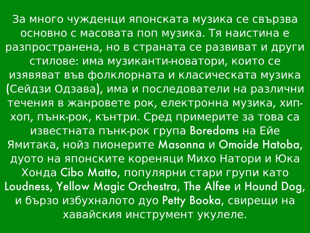 За много чужденци японската музика се свързва основно с масовата поп музика. Тя наистина е разпространена, но в страната се развиват и други стилове: има музиканти-новатори, които се изявяват във фолклорната и класическата музика (Сейдзи Одзава), има и последователи на различни течения в жанровете рок, електронна музика, хип-хоп, пънк-рок, кънтри. Сред примерите за това са известната пънк-рок група Boredoms на Ейе Ямитака, нойз пионерите Masonna и Omoide Hatoba, дуото на японските кореняци Михо Натори и Юка Хонда Cibo Matto, популярни стари групи като Loudness, Yellow Magic Orchestra, The Alfee и Hound Dog, и бързо избухналото дуо Petty Booka, свирещи на хавайския инструмент укулеле.