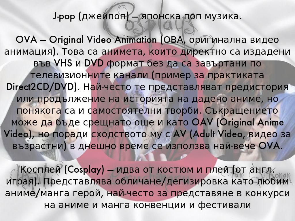 Косплей (Cosplay) — идва от костюм и плей (от англ. играя). Представлява обличане/дегизировка като любим аниме/манга герой, най-често за представяне в конкурси на аниме и манга конвенции и фестивали