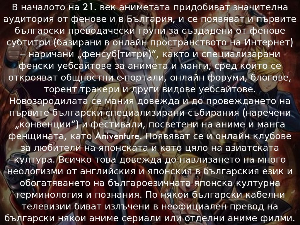 В началото на 21. век аниметата придобиват значителна аудитория от фенове и в България, и се появяват и първите български преводачески групи за създадени от фенове субтитри (базирани в онлайн пространството на Интернет) — наричани „фенсуб(титри)“, както и специализарани фенски уебсайтове за анимета и манги, сред които се открояват общностни е-портали, онлайн форуми, блогове, торент тракери и други видове уебсайтове. Новозародилата се мания довежда и до провеждането на първите български специализирани събирания (наречени „конвенции“) и фестивали, посветени на аниме и манга фенщината, като Aniventure. Появяват се и онлайн клубове за любители на японската и като цяло на азиатската култура. Всичко това довежда до навлизането на много неологизми от английския и японския в българския език и обогатяването на българоезичната японска културна терминология и познания. По някои български кабелни телевизии биват излъчени в неофициален превод на български някои аниме сериали или отделни аниме филми.