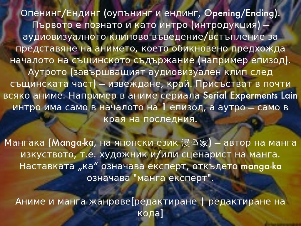 Опенинг/Ендинг (оупънинг и ендинг, Opening/Ending). Първото е познато и като интро (интродукция) — аудиовизуалното клипово въведение/встъпление за представяне на анимето, което обикновено предхожда началото на същинското съдържание (например епизод). Аутрото (завършващият аудиовизуален клип след същинската част) — извеждане, край. Присъстват в почти всяко аниме. Например в аниме сериала Serial Experments Lain интро има само в началото на 1 епизод, а аутро — само в края на последния.