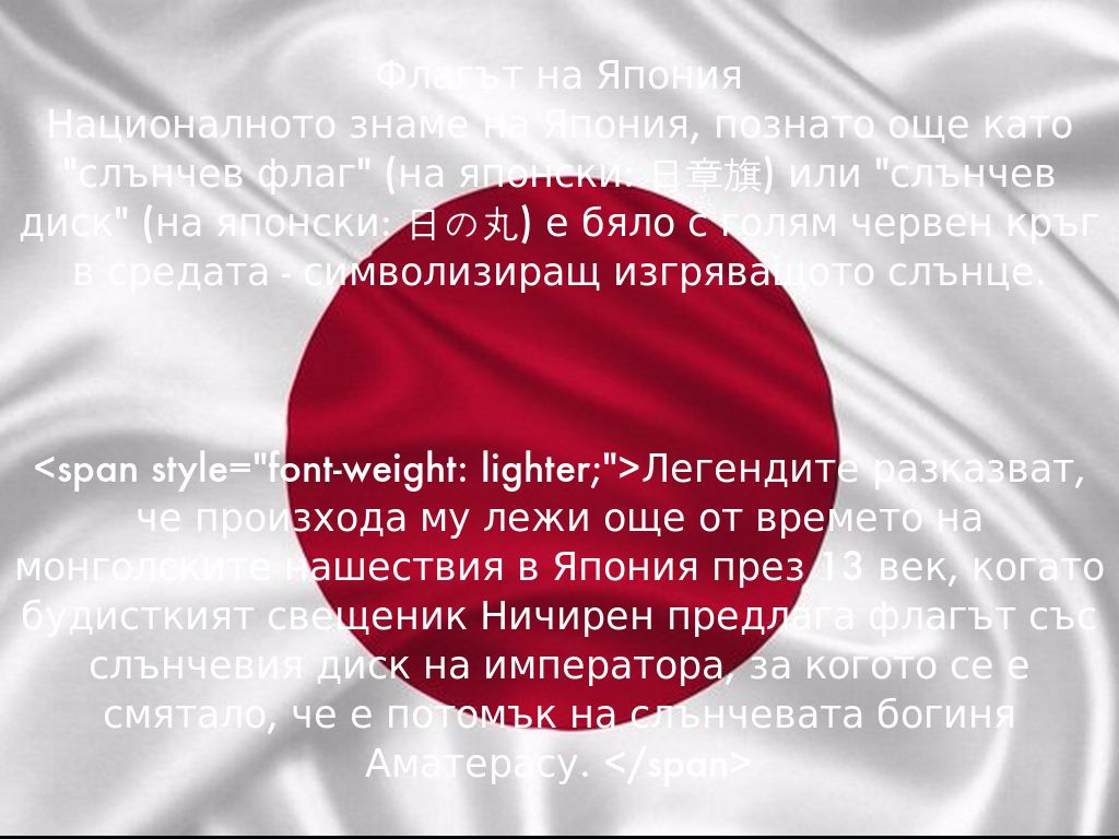 Националното знаме на Япония, познато още като "слънчев флаг" (на японски: 日章旗) или "слънчев диск" (на японски: 日の丸) е бяло с голям червен кръг в средата - символизиращ изгряващото слънце.