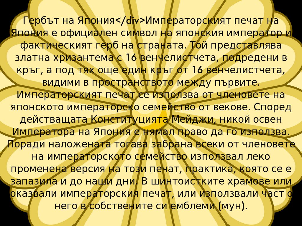 Гербът на ЯпонияИмператорският печат на Япония е официален символ на японския император и фактическият герб на страната. Той представлява златна хризантема с 16 венчелистчета, подредени в кръг, а под тях още един кръг от 16 венчелистчета, видими в пространството между първите.