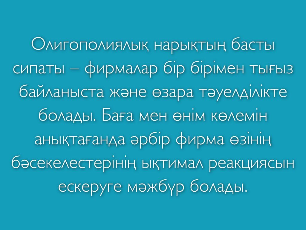 Олигополиялық нарықтың басты сипаты – фирмалар бір бірімен тығыз байланыста және өзара тәуелділікте болады. Баға мен өнім көлемін анықтағанда әрбір фирма өзінің бәсекелестерінің ықтимал реакциясын ескеруге мәжбүр болады.