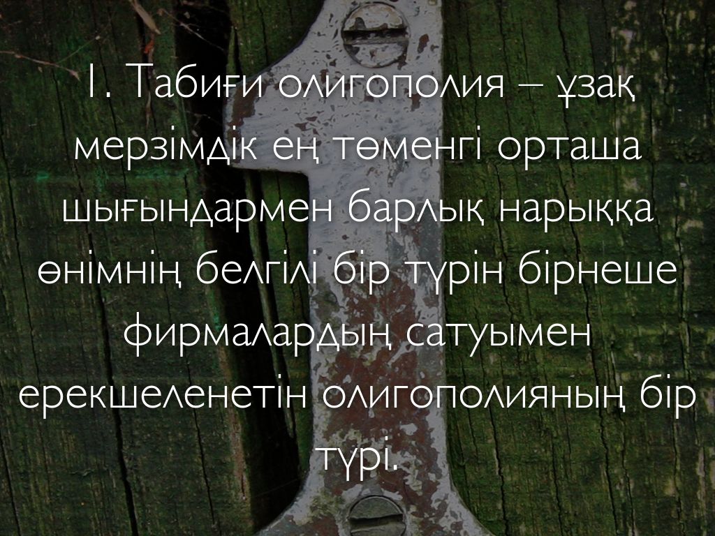 1. Табиғи олигополия – ұзақ мерзімдік ең төменгі орташа шығындармен барлық нарыққа өнімнің белгілі бір түрін бірнеше фирмалардың сатуымен ерекшеленетін олигополияның бір түрі.