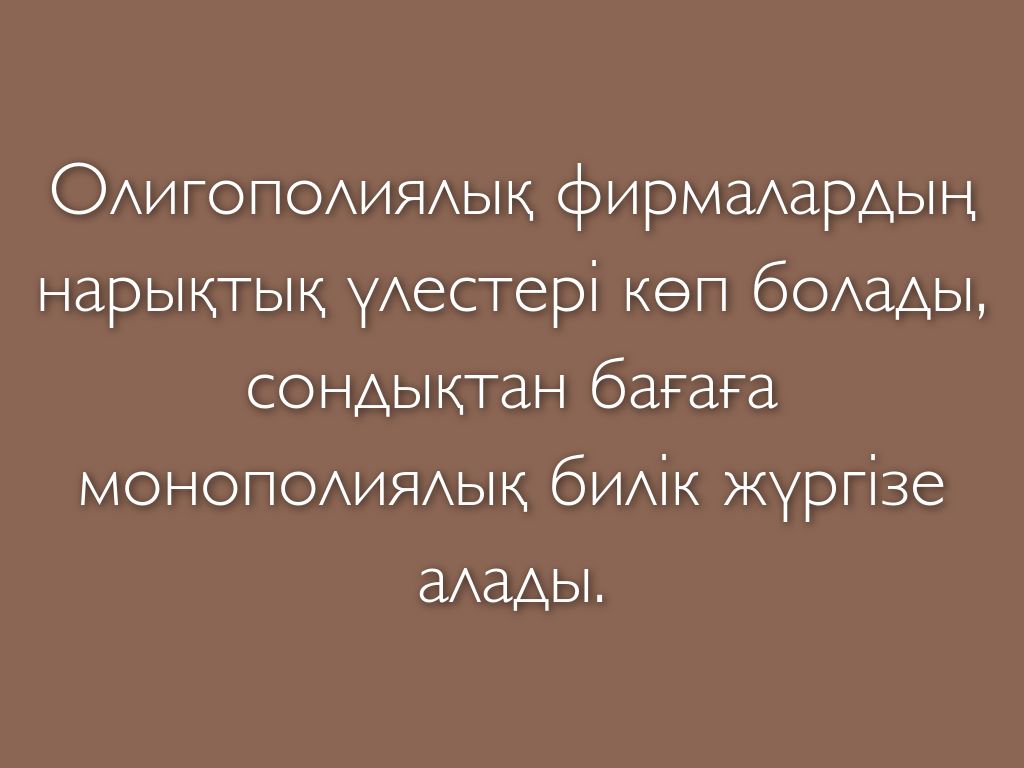 Олигополиялық фирмалардың нарықтық үлестері көп болады, сондықтан бағаға монополиялық билік жүргізе алады.
