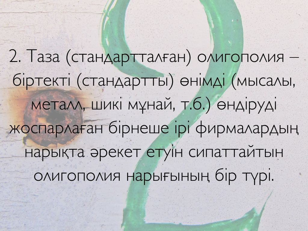 2. Таза (стандартталған) олигополия – біртекті (стандартты) өнімді (мысалы, металл, шикі мұнай, т.б.) өндіруді жоспарлаған бірнеше ірі фирмалардың нарықта әрекет етуін сипаттайтын олигополия нарығының бір түрі.