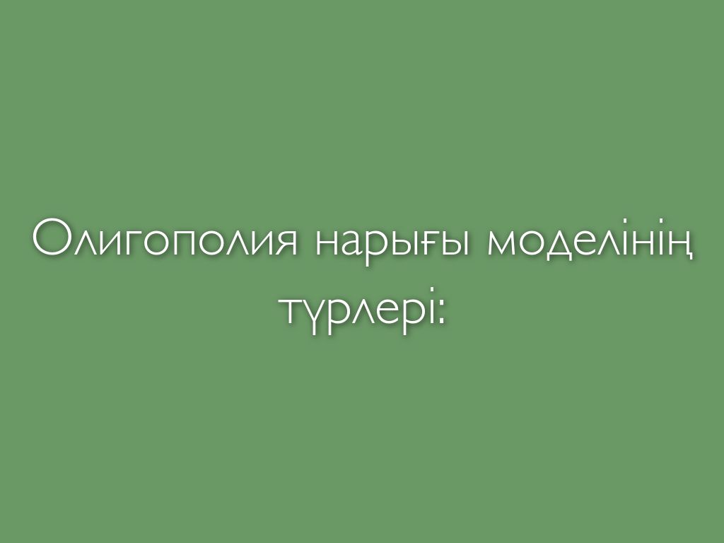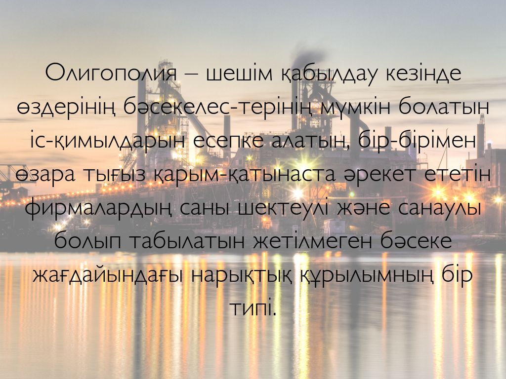 Олигополия – шешім қабылдау кезінде өздерінің бәсекелес-терінің мүмкін болатын іс-қимылдарын есепке алатын, бір-бірімен өзара тығыз қарым-қатынаста әрекет ететін фирмалардың саны шектеулі және санаулы болып табылатын жетілмеген бәсеке жағдайындағы нарықтық құрылымның бір типі.