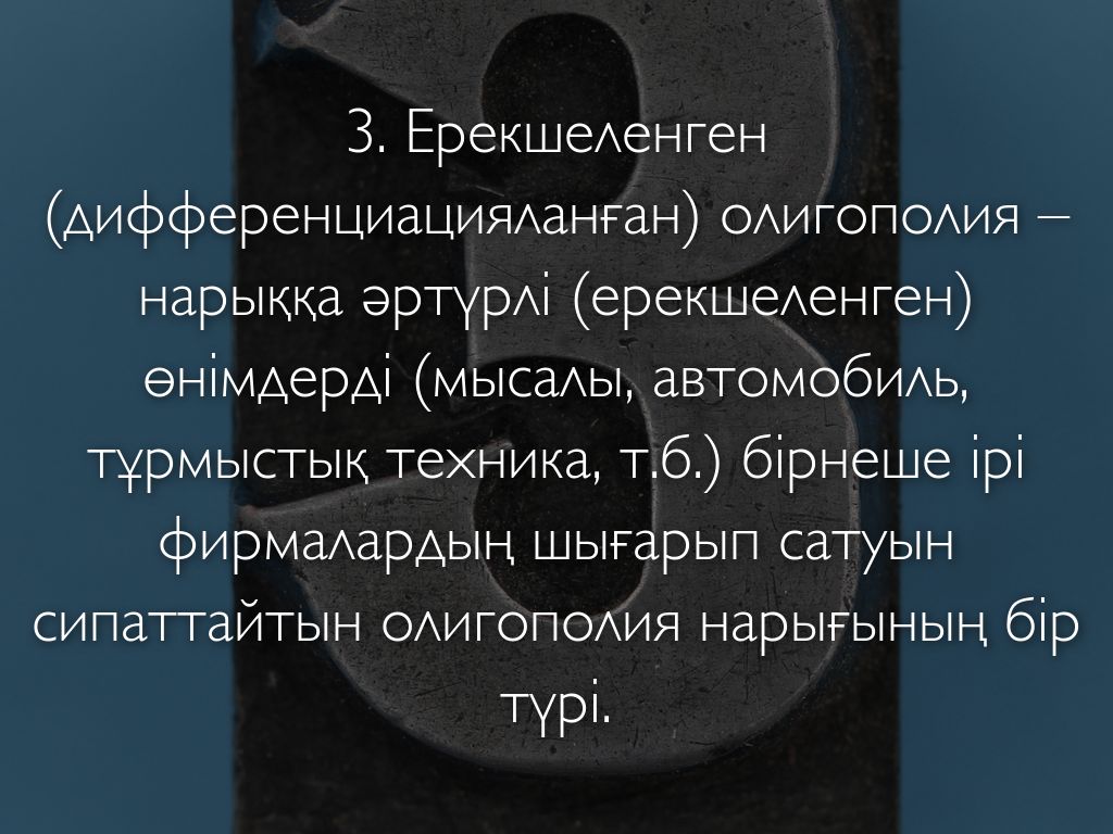 3. Ерекшеленген (дифференциацияланған) олигополия – нарыққа әртүрлі (ерекшеленген) өнімдерді (мысалы, автомобиль, тұрмыстық техника, т.б.) бірнеше ірі фирмалардың шығарып сатуын сипаттайтын олигополия нарығының бір түрі.