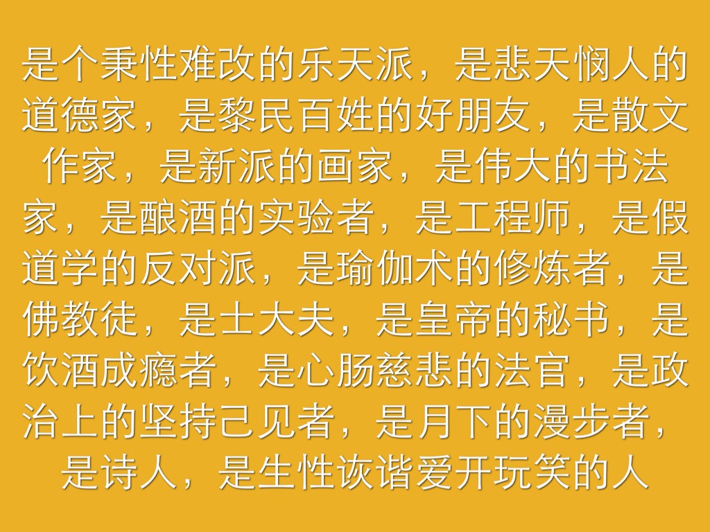 是个秉性难改的乐天派,是悲天悯人的道德家,是黎民百姓的好朋友,是散文作家,是新派的画家,是伟大的书法家,是酿酒的实验者,是工程师,是假道学的反对派,是瑜伽术的修炼者,是佛教徒,是士大夫,是皇帝的秘书,是饮酒成瘾者,是心肠慈悲的法官,是政治上的坚持己见者,是月下的漫步者,是诗人,是生性诙谐爱开玩笑的人