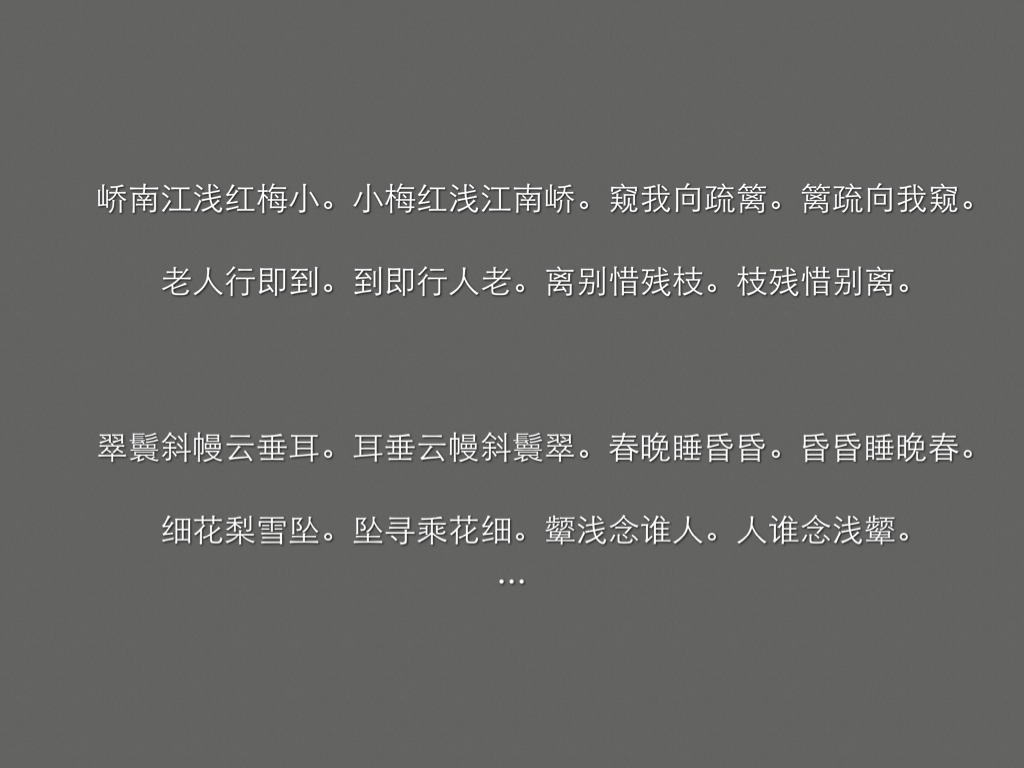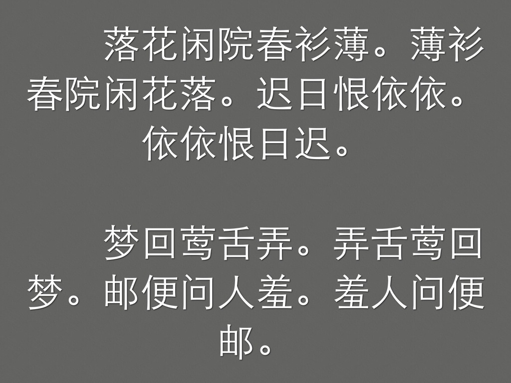 落花闲院春衫薄。薄衫春院闲花落。迟日恨依依。依依恨日迟。