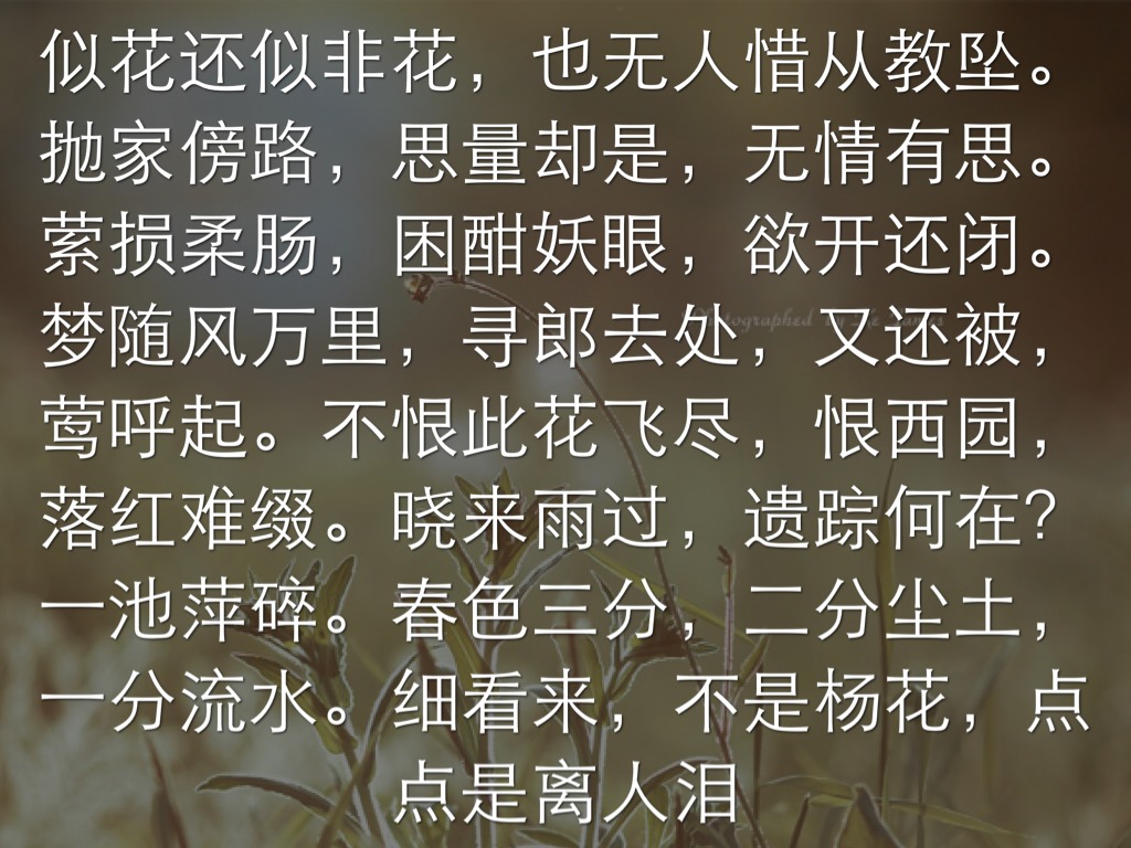 似花还似非花,也无人惜从教坠。抛家傍路,思量却是,无情有思。萦损柔肠,困酣妖眼,欲开还闭。梦随风万里,寻郎去处,又还被,莺呼起。不恨此花飞尽,恨西园,落红难缀。晓来雨过,遗踪何在? 一池萍碎。春色三分,二分尘土,一分流水。细看来,不是杨花,点点是离人泪