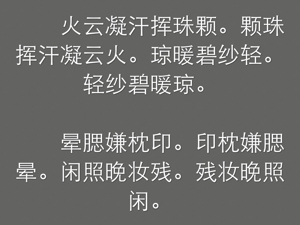 火云凝汗挥珠颗。颗珠挥汗凝云火。琼暖碧纱轻。轻纱碧暖琼。