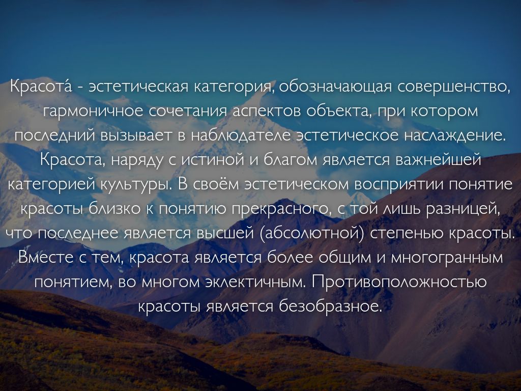 « Красота – всё красивое, прекрасное, всё то, что доставляет эстетическое и нравственное наслаждение». Словарь русского языка. С.И. Ожегов