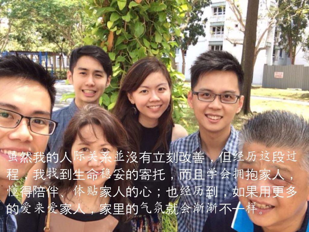 虽然我的人际关系並沒有立刻改善,但经历这段过程,我找到生命稳妥的寄托,而且学会拥抱家人,懂得陪伴、体贴家人的心;也经历到,如果用更多的爱来爱家人,家里的气氛就会渐渐不一样。