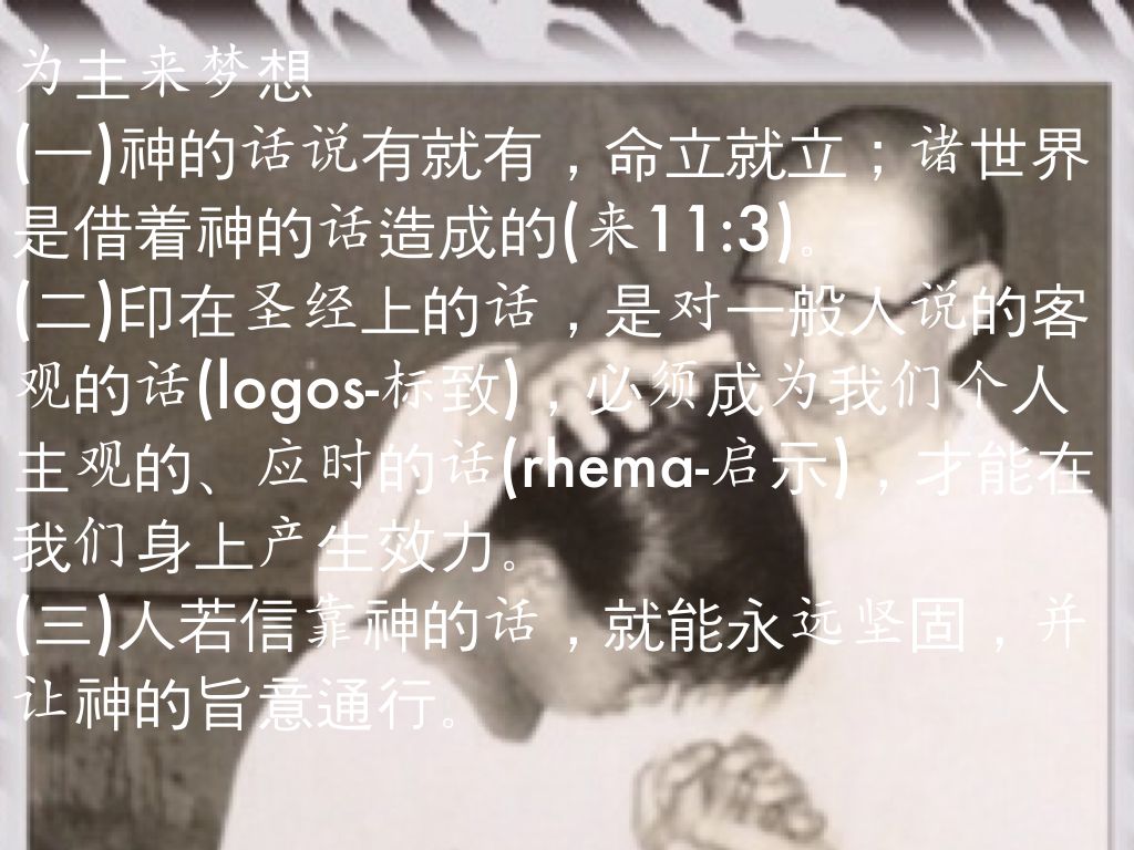 (二)印在圣经上的话,是对一般人说的客观的话(logos-标致),必须成为我们个人主观的、应时的话(rhema-启示),才能在我们身上产生效力。