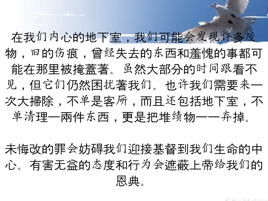 在我们内心的地下室,我们可能会发现许多废物,旧的伤痕,曾经失去的东西和羞愧的事都可能在那里被掩蓋著。虽然大部分的时间跟看不见,但它们仍然困扰著我们。也许我们需要来一次大掃除,不单是客厛,而且还包括地下室,不单清理一兩件东西,更是把堆绩物一一弃掉。