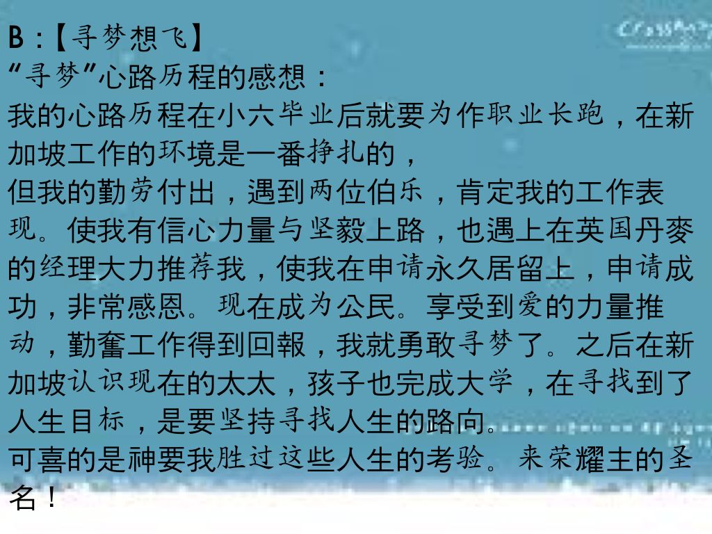 我的心路历程在小六毕业后就要为作职业长跑,在新加坡工作的环境是一番挣扎的,