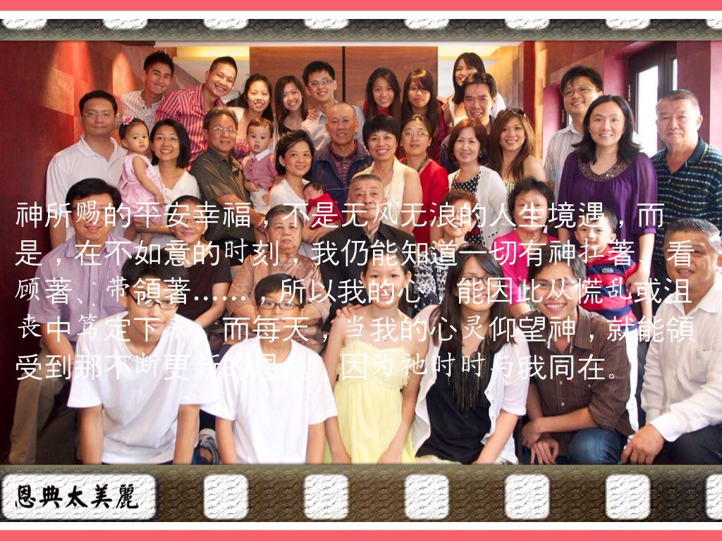 神所赐的平安幸福,不是无风无浪的人生境遇,而是,在不如意的时刻,我仍能知道一切有神扛著、看顾著、带領著……,所以我的心,能因此从慌乱或沮丧中笃定下来。而每天,当我的心灵仰望神,就能領受到那不断更新的恩典,因为祂时时与我同在。