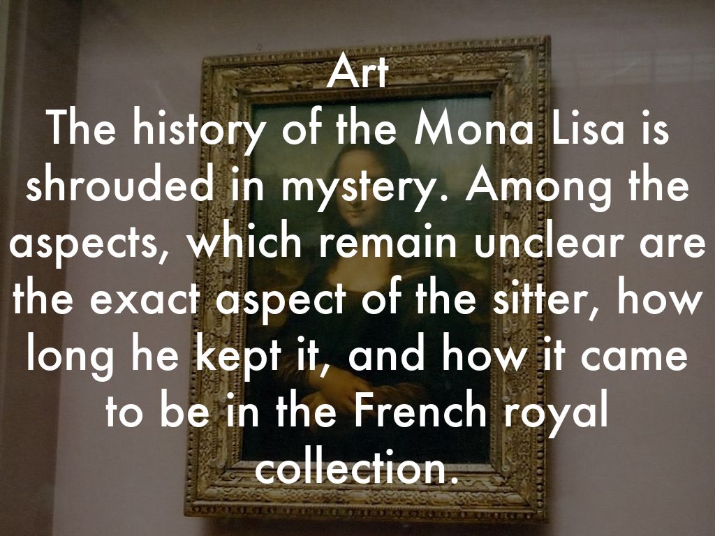 The history of the Mona Lisa is shrouded in mystery. Among the aspects, which remain unclear are the exact aspect of the sitter, how long he kept it, and how it came to be in the French royal collection.