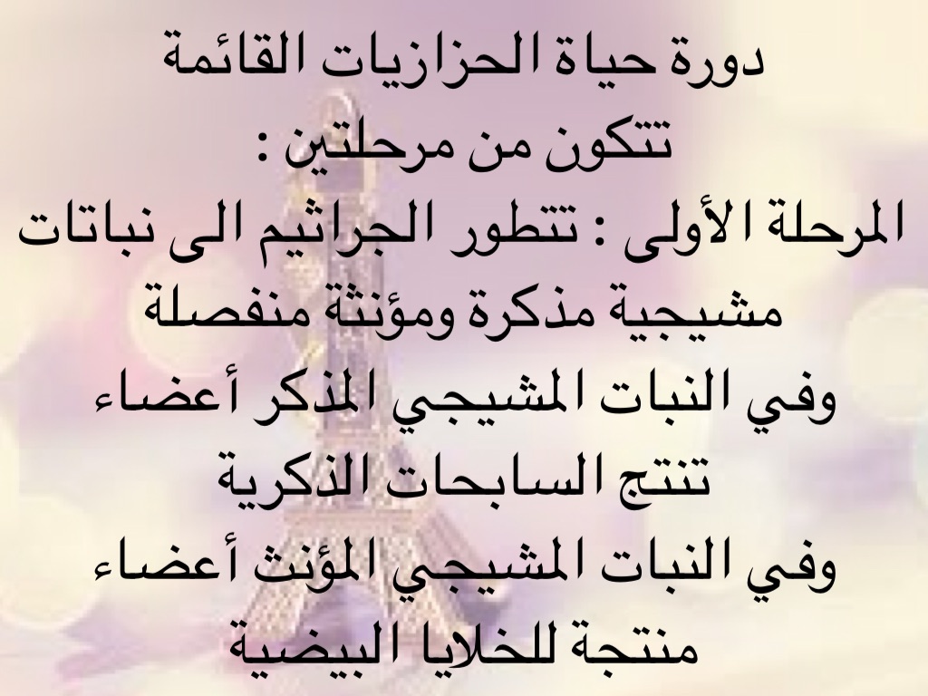 المرحلة الأولى : تتطور الجراثيم الى نباتات مشيجية مذكرة ومؤنثة منفصلة