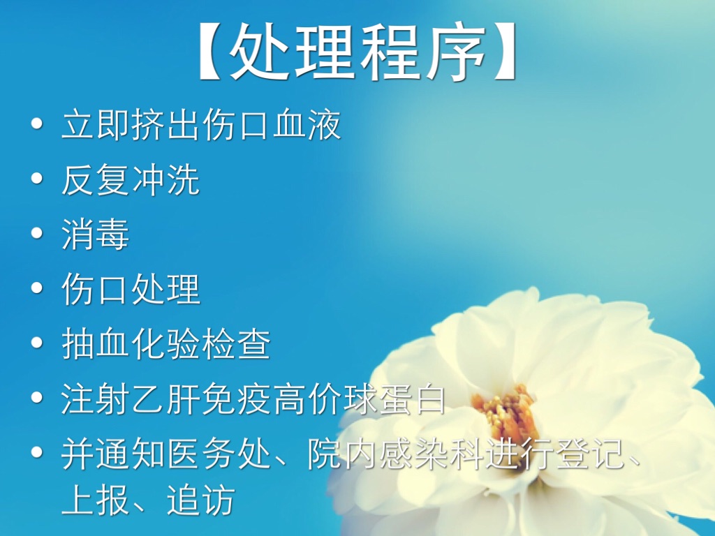 • 被HIV阳性患者血液、体液污染的锐器刺伤后,应在24h内去预防保健科抽血查HIV抗体,必要时同时抽患者血对比,按1个月3个月、6个月复查,同时口服贺'普丁(拉米呋定)每日1片,并通知医务处、院内感染科进行登记、上报、追访等。