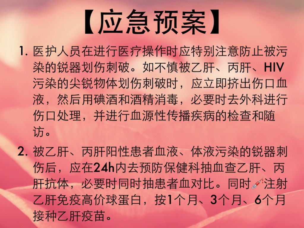 • 被乙肝、丙肝阳性患者血液、体液污染的锐器刺伤后,应在24h内去预防保健科抽血查乙肝、丙肝抗体,必要时同时抽患者血对比。同时💉注射乙肝免疫高价球蛋白,按1个月、3个月、6个月接种乙肝疫苗。