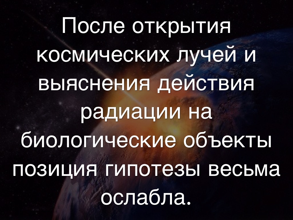 После открытия космических лучей и выяснения действия радиации на биологические объекты позиция гипотезы весьма ослабла.