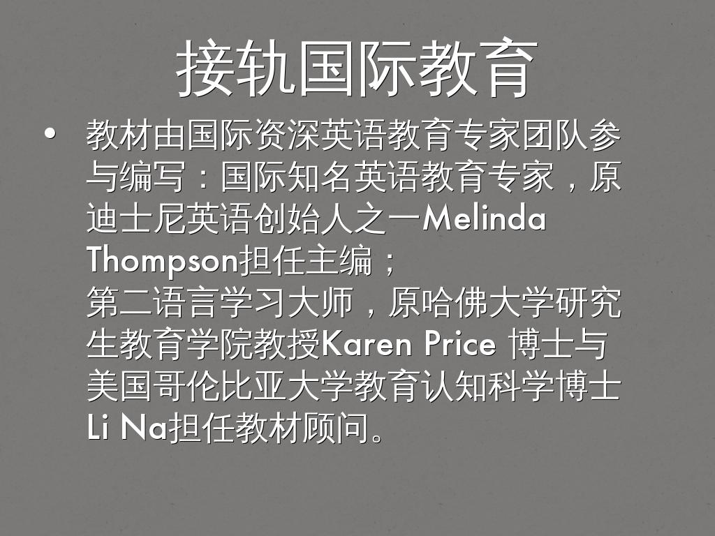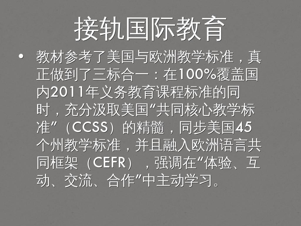 教材参考了美国与欧洲教学标准,真正做到了三标合一:在100%覆盖国内2011年义务教育课程标准的同时,充分汲取美国“共同核心教学标准”(CCSS)的精髓,同步美国45个州教学标准,并且融入欧洲语言共同框架(CEFR),强调在“体验、互动、交流、合作”中主动学习。