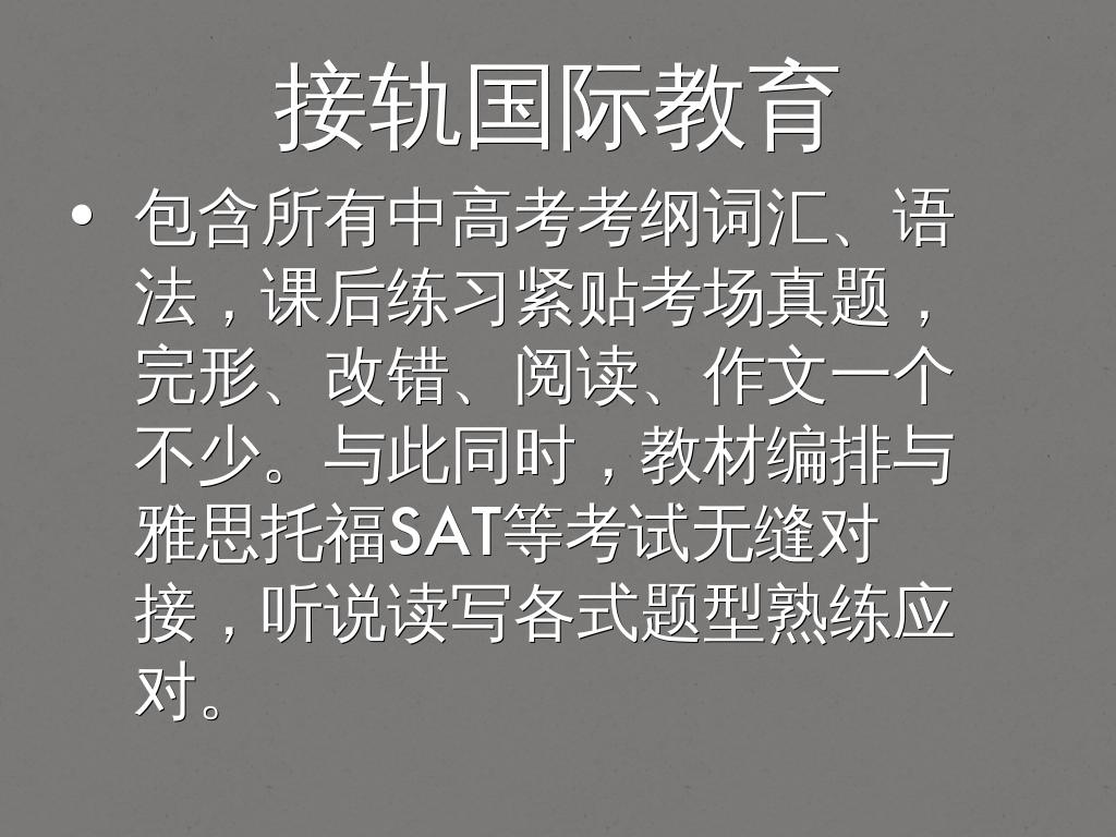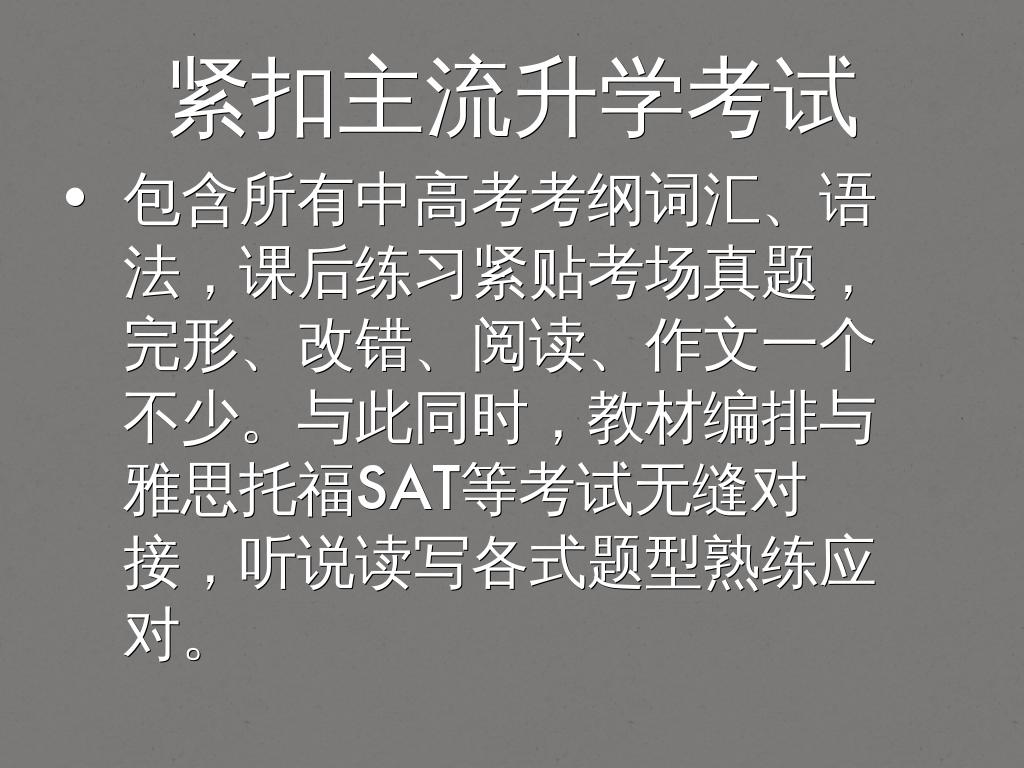 包含所有中高考考纲词汇、语法,课后练习紧贴考场真题,完形、改错、阅读、作文一个不少。与此同时,教材编排与雅思托福SAT等考试无缝对接,听说读写各式题型熟练应对。