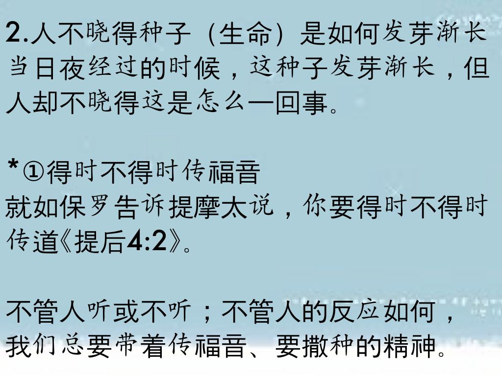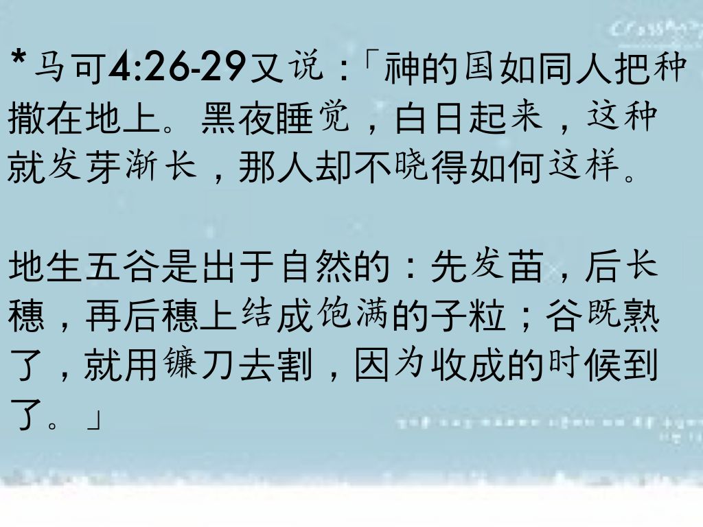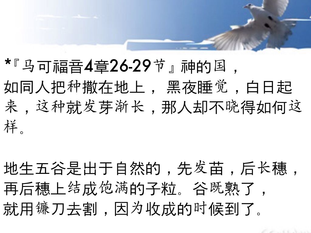 *马可4:26-29又说:「神的国如同人把种撒在地上。黑夜睡觉,白日起来,这种就发芽渐长,那人却不晓得如何这样。