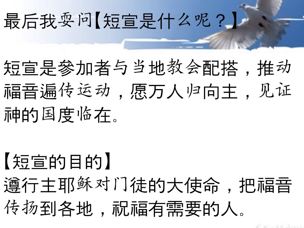 短宣是參加者与当地教会配搭,推动福音遍传运动,愿万人归向主,见证神的国度临在。