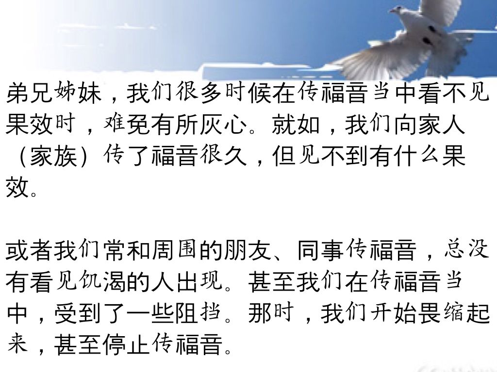 弟兄姊妹,我们很多时候在传福音当中看不见果效时,难免有所灰心。就如,我们向家人(家族)传了福音很久,但见不到有什么果效。