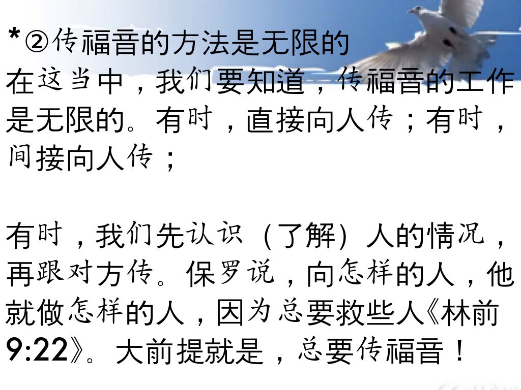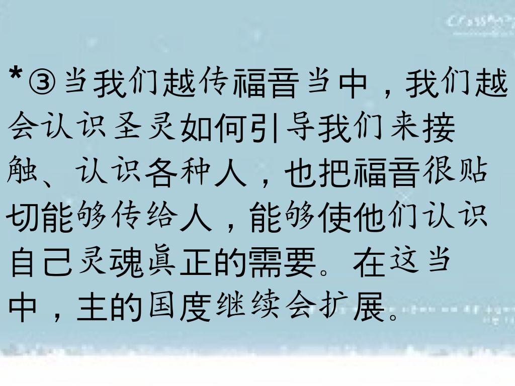 *③当我们越传福音当中,我们越会认识圣灵如何引导我们来接触、认识各种人,也把福音很贴切能够传给人,能够使他们认识自己灵魂真正的需要。在这当中,主的国度继续会扩展。