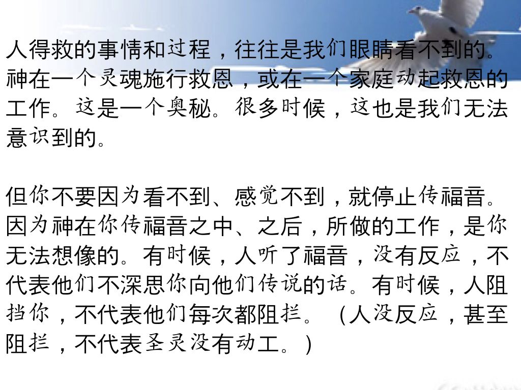 但你不要因为看不到、感觉不到,就停止传福音。因为神在你传福音之中、之后,所做的工作,是你无法想像的。有时候,人听了福音,没有反应,不代表他们不深思你向他们传说的话。有时候,人阻挡你,不代表他们每次都阻拦。(人没反应,甚至阻拦,不代表圣灵没有动工。)