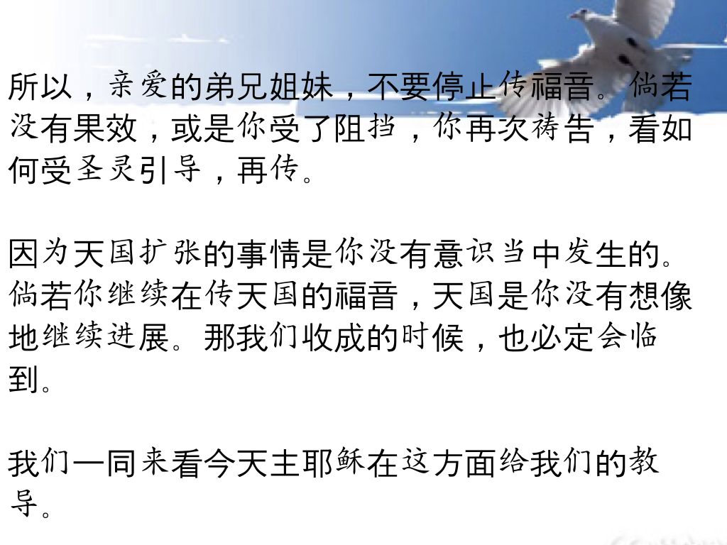 因为天国扩张的事情是你没有意识当中发生的。倘若你继续在传天国的福音,天国是你没有想像地继续进展。那我们收成的时候,也必定会临到。