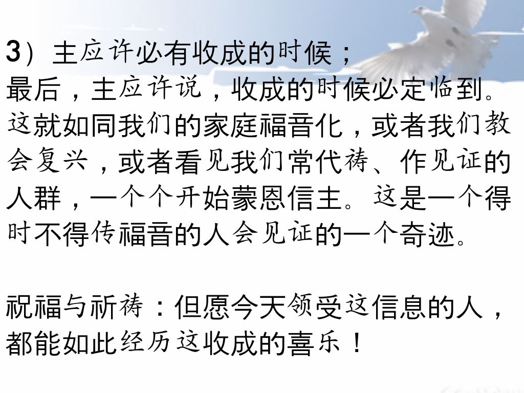 最后,主应许说,收成的时候必定临到。这就如同我们的家庭福音化,或者我们教会复兴,或者看见我们常代祷、作见证的人群,一个个开始蒙恩信主。这是一个得时不得传福音的人会见证的一个奇迹。