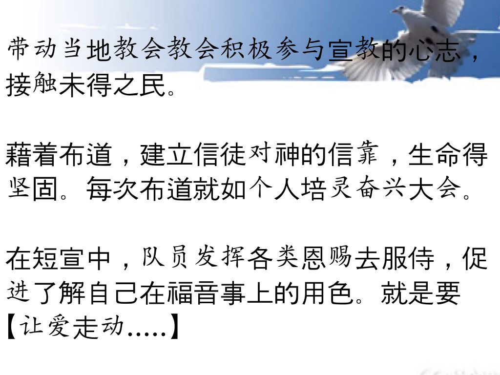 在短宣中,队员发挥各类恩赐去服侍,促进了解自己在福音事上的用色。就是要【让爱走动.....】