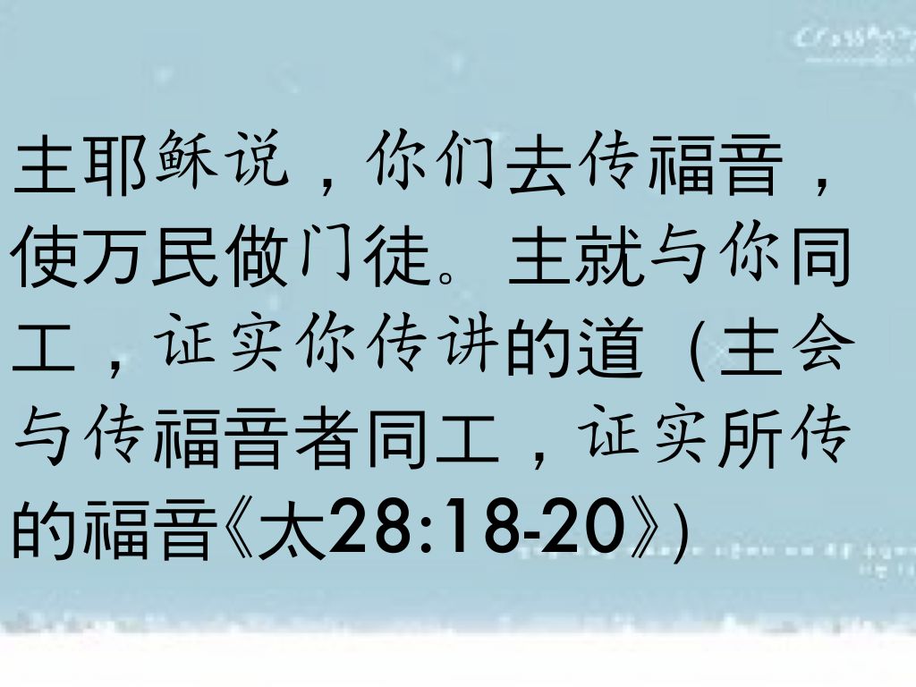 使万民做门徒。主就与你同工,证实你传讲的道(主会与传福音者同工,证实所传的福音《太28:18-20》)