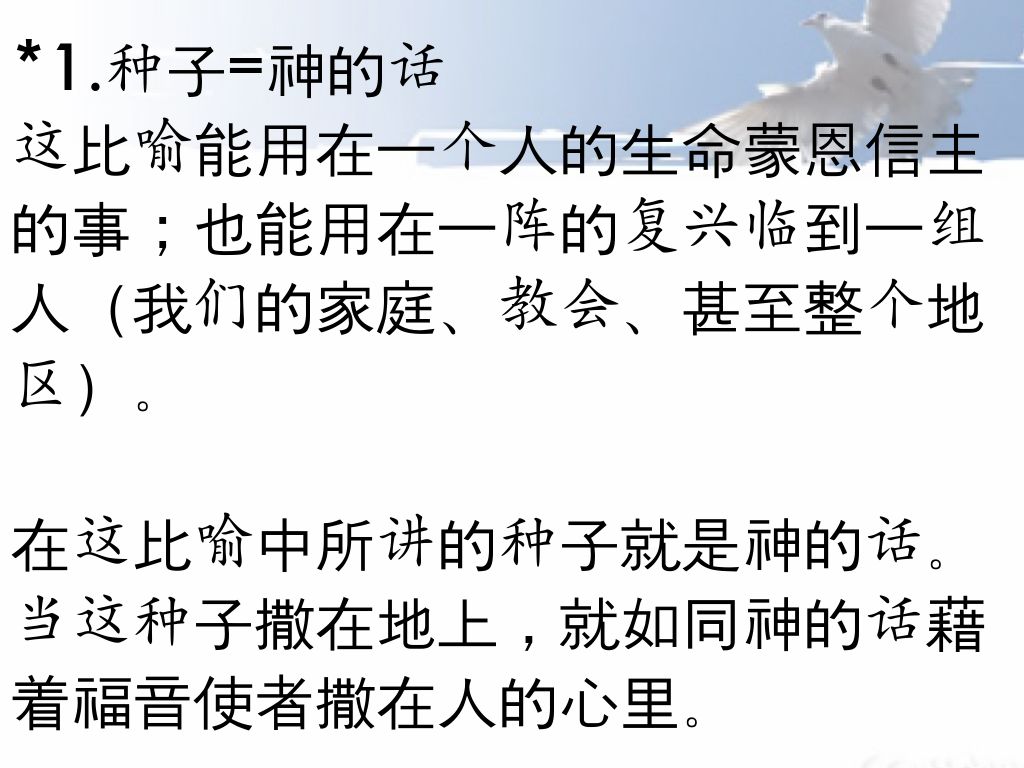 在这比喻中所讲的种子就是神的话。当这种子撒在地上,就如同神的话藉着福音使者撒在人的心里。