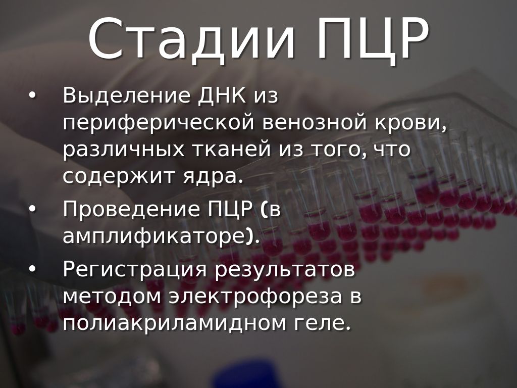 • Выделение ДНК из периферической венозной крови, различных тканей из того, что содержит ядра.