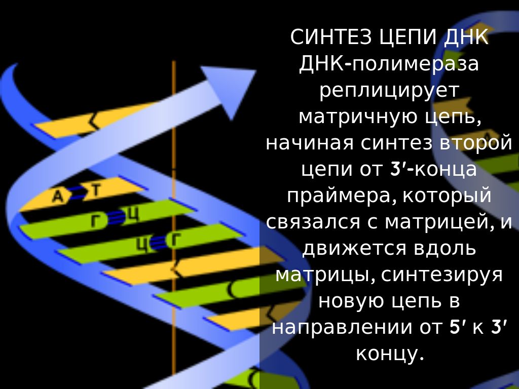 ДНК-полимераза реплицирует матричную цепь, начиная синтез второй цепи от 3'-конца праймера, который связался с матрицей, и движется вдоль матрицы, синтезируя новую цепь в направлении от 5' к 3' концу.