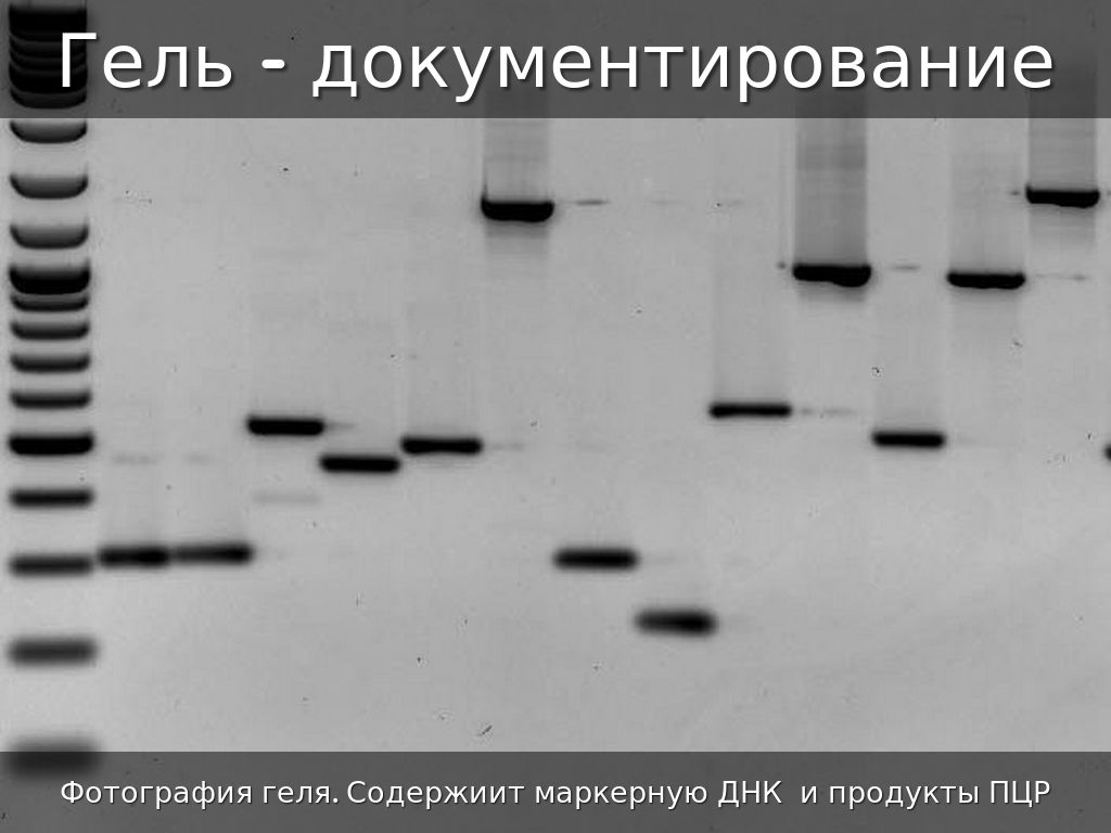 Фотография геля. Содержиит маркерную ДНК  и продукты ПЦР