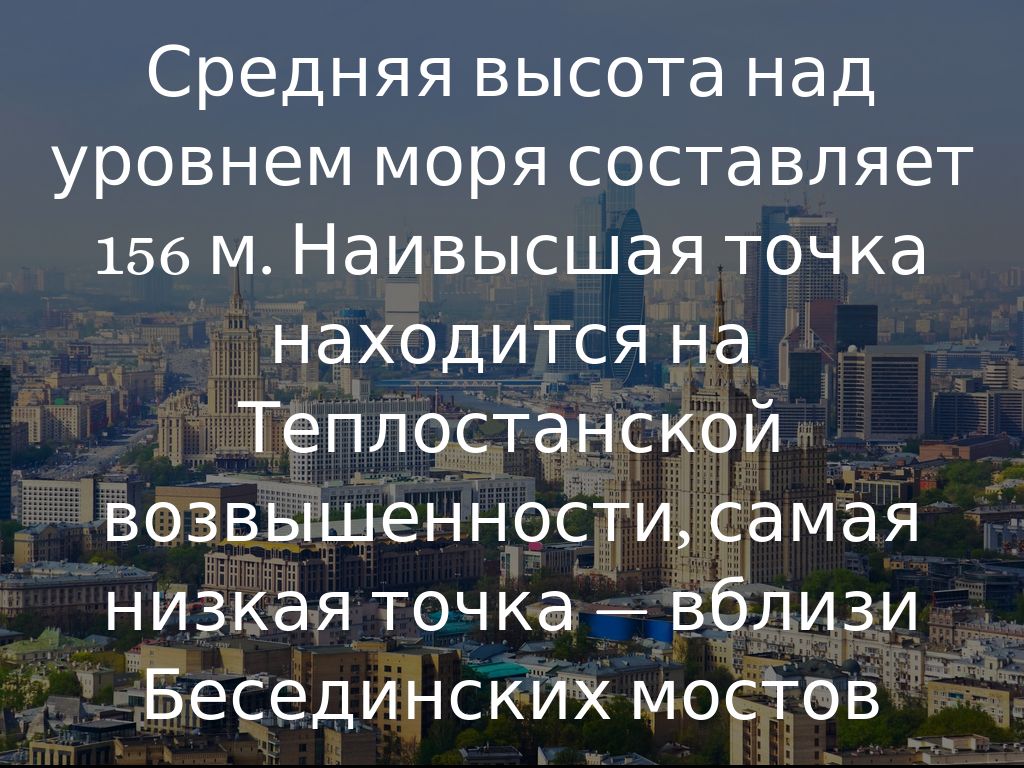 Средняя высота над уровнем моря составляет 156 м. Наивысшая точка находится на Теплостанской возвышенности, самая низкая точка — вблизи Бесединских мостов
