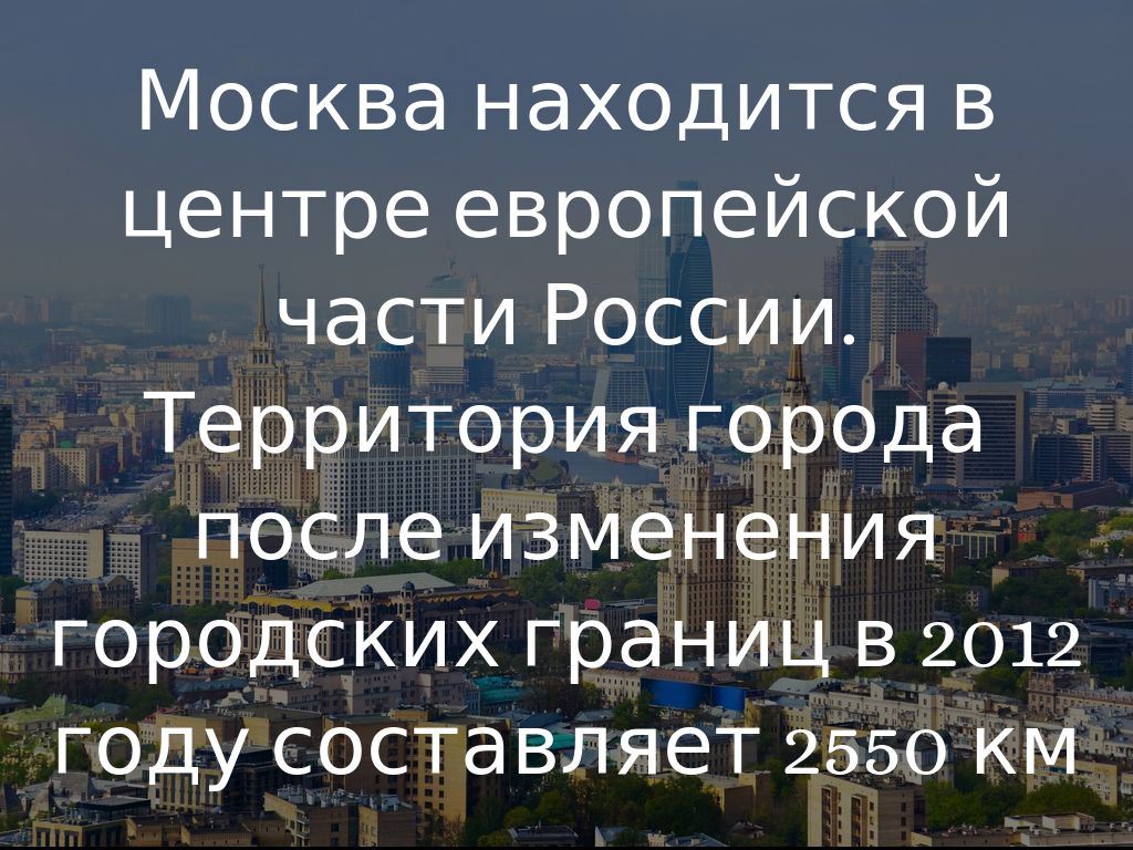 Москва находится в центре европейской части России. Территория города после изменения городских границ в 2012 году составляет 2550 км