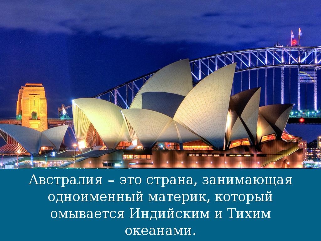 Австралия – это страна, занимающая одноименный материк, который омывается Индийским и Тихим океанами.