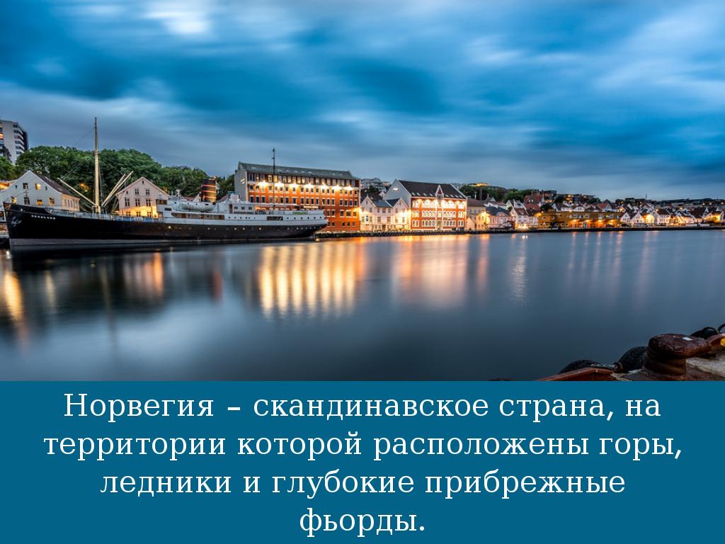 Норвегия – скандинавское страна, на территории которой расположены горы, ледники и глубокие прибрежные фьорды.